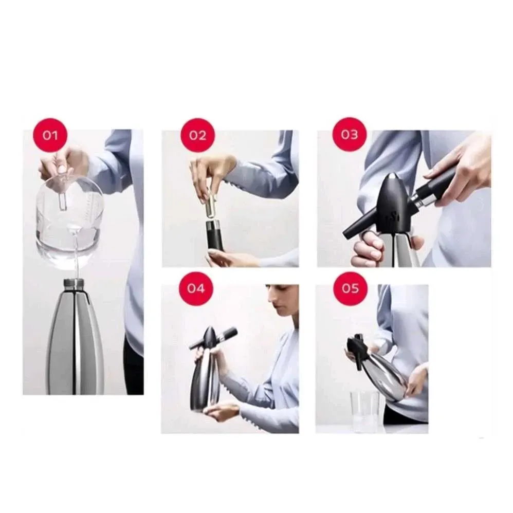 Botella de sifón de acero inoxidable, cabezal de plástico de alto impacto, soporte de cargador, tubo de medición y llave de extracción para un fácil llenado y tapa antipolvo.